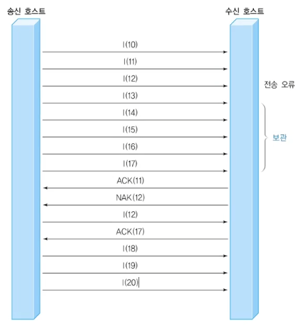 - 수신자는 자신의 윈도우를 왼쪽으로 이동시키면서 상위 계층으로 전달 할 수 있는 패킷을 찾는다. 만약 순서대로 받지 못한 패킷이 있으면 NAK(negative acknowledgement)를 보내어 재전송을 요청한다.