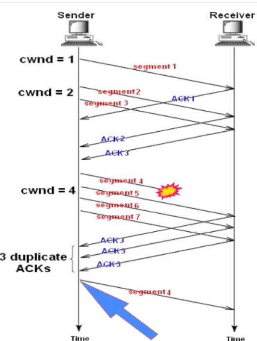 이런 상황이 발생했을 때 수신측에서는 순서대로 잘 도착한 마지막 패킷의 다음 순번을 ACK 패킷에 실어서 보낸다. 그러므로 ACK 3 번의 (다음 순번4)를 담아서 보낸다. 그리고 이런 중복 ACK를 3개 받으면 재전송이 이루어진다.