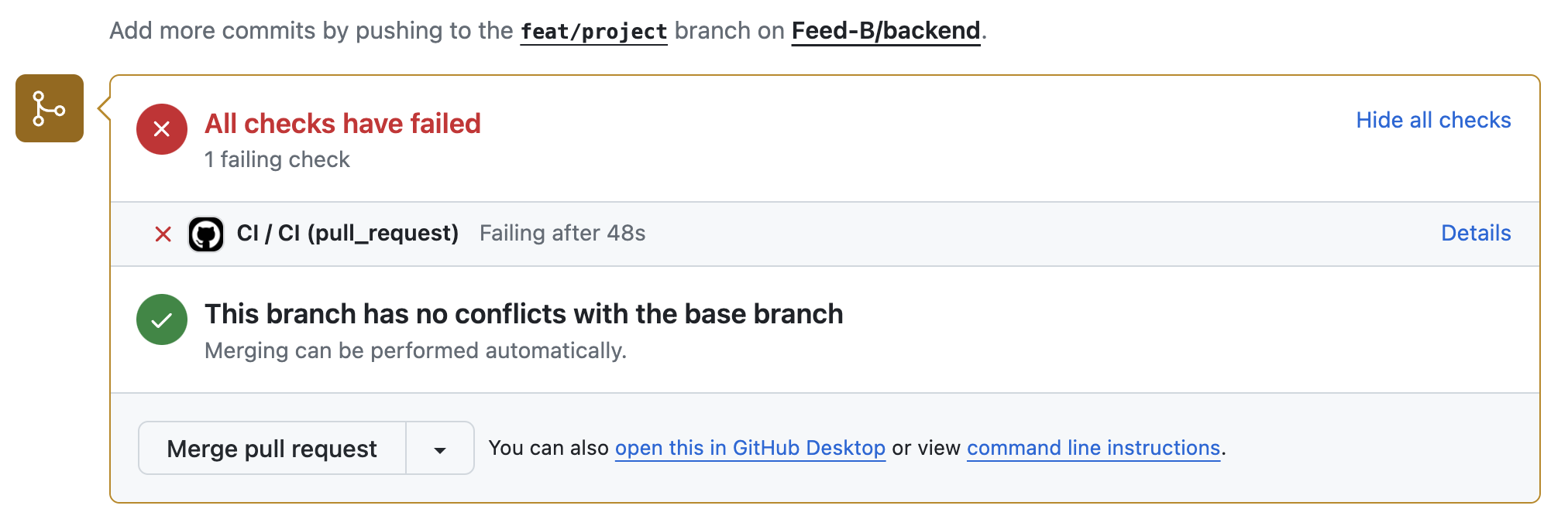 위와 같이 작성이 완료되면 Pull Request를 통해 정상 작동 하는 지 확인(만약 Build 또는 Test 과정에서 문제가 있으면 하단의 이미지와 같이 개발자들이 인지할 수 있습니다.)